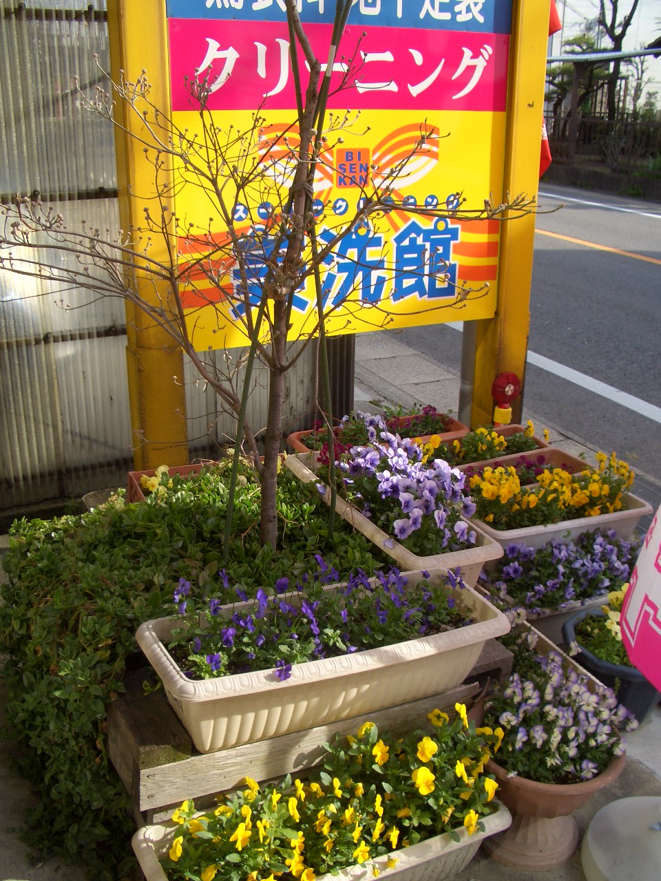 今年も種から育てたパンジーが咲いてくれました。4月の店の前です。今年はクリーニング『美洗館』の看板もふえました。店のイメージカラーは黄色ですので、今年は黄色と紫色を基準に植えました。