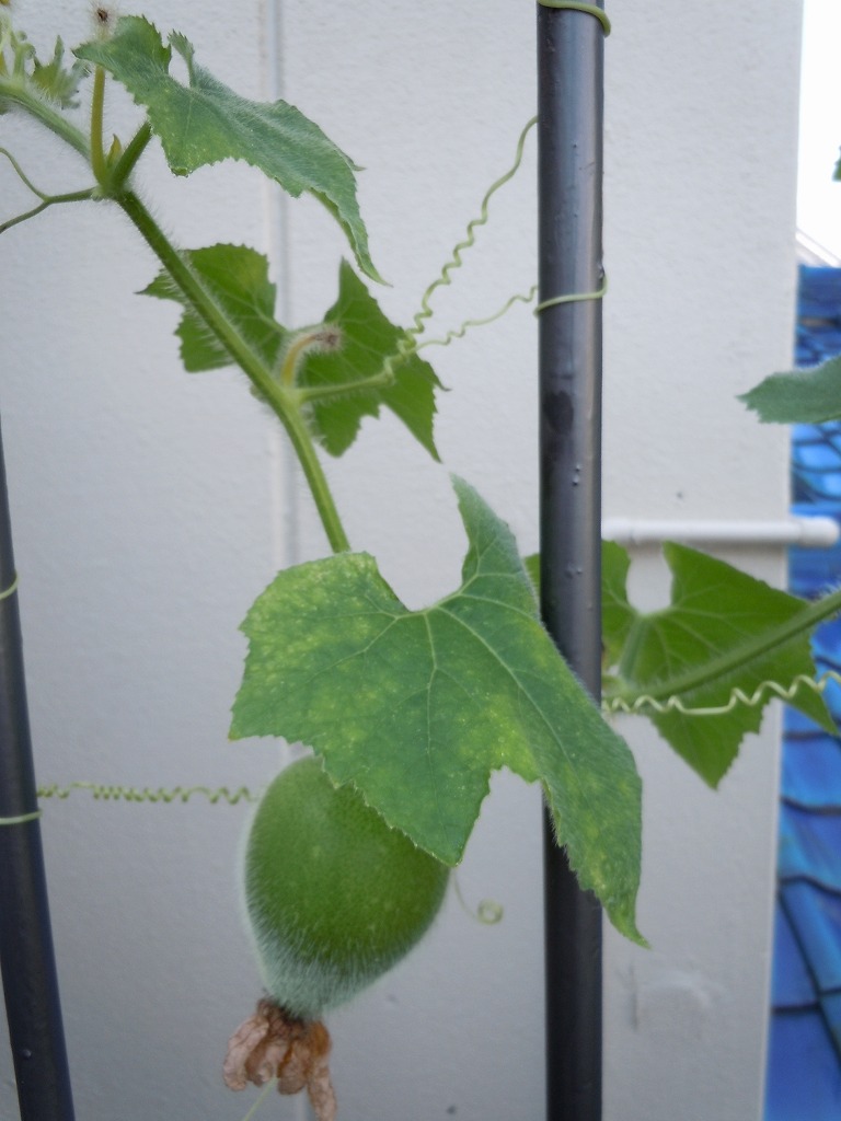 先日載せた記事でベランダのプランターに植えてある方、実ができて、やはり冬瓜(とうがん)のようです。